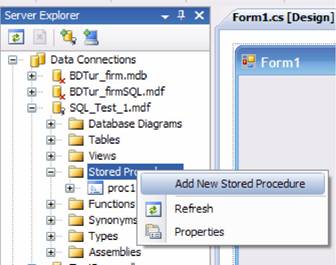 Среда Visual Studio 2008 предоставляет интерфейс для создания хранимых процедур в базе данных при наличии подключения к ней. Запустим Visual Studio (даже нет необходимости создавать какой-либо проект), перейдем на вкладку «Обозреватель баз данных» («Server Explorer»), раскрываем подключение к базе данных, затем на узле «Хранимые процедуры» («Stored Procedures») щелкаем правой кнопкой и выбираем пункт «Добавить новую хранимую процедуру» («New Stored Procedure») (рис. 72).