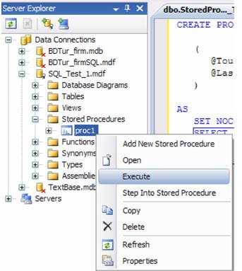 Рис. 72. Создание новой процедуры в окне «Server Explorer» Появляется шаблон структуры, сгенерированный мастером: CREATE PROCEDURE dbo.StoredProcedurel /* Для того чтобы приступить к редактированию, достаточно убрать знаки комментариев «/*», «*/». Команда NOCOUNT со значением ON отключает выдачу сообщений о количестве строк таблицы, получающейся в качестве запроса. Необходимость данного оператора заключается в том, что при использовании более чем одного оператора (SELECT, INSERT, UPDATE или DELETE) в начале запроса надо поставить команду SET NOCOUNT ON, а перед последним оператором SELECT - команду SET NOCOUNT OFF. Например, хранимую процедуру proc_po1 (см. таблицу 15) можно переписать следующим образом: CREATE PROCEDURE dbo.proc_vs1 ( После завершения редактирования SQL-конструкция будет обведена синей рамкой. Щелкнув правой кнопкой в этой области и выбрав пункт меню «Разработать блок SQL» («Design SQL Block»), можно перейти к построителю запросов (Query Builder) (рис. 73). Для выполнения процедуры необходимо в выпадающем меню процедуры, представленном на рисунке 74, выбрать пункт Execute.
