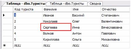 Рис. 77. Таблица «Туристы», изменение записи Метод ExecuteNonQuery неявно возвращает результат выполнения запроса в виде количества измененных записей. Это значение может применяться для проверки правильности выполнения запроса, например, следующим образом: int UspeshnoeIzmenenie = myCommand.ExecuteNonQuery(); Отметим, что данный вариант текста не позволяет отличить обновление одной строки и нескольких строк. Закомментируем имеющееся свойство CommandText и добавим новое: myCommand.CommandText = "INSERT " + Запускаем приложение, затем переходим в SQL Server Enterprise Manager - запрос добавил новую запись (рис. 78).