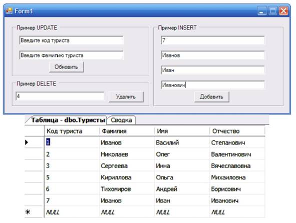 Рис. 87. Разработанное приложение, вид формы в режиме дизайна Подключаем пространство имен для работы с базой данных: using System.Data.SqlClient; В классе формы создаем экземпляр conn: SqlConnection conn = null; Обработчик кнопки btnUpdate будет иметь следующий вид: private void btnUpdate_Click(object sender, System.EventArgs e) { Обратим внимание на то, что в блоке finally происходит закрытие соединения, это нужно сделать в любом случае, независимо от результата выполнения команды. Значения, введенные пользователем в текстовые поля txtFamilyUpdate и txtTouristIDUpdate, помещаются в переменные Family и TouristID. В запросе к базе данных используются два параметра - @Family и @TouristID. Они добавляются в коллекцию объекта Command с помощью метода Add свойства Parameters, а затем значения параметров устанавливаются равными переменным Family и TouristID. Метод Add перегружен. Использованный в данном фрагменте кода первый вариант этого метода принимает наибольшее количество свойств. Описание некоторых свойств метода Add приводится в таблице 16. Конструкция метода Add, свойства Parameters объекта Command для поставщика данных OLE DB имеет в точности такую же структуру. Таблица 16. Свойства метода Add