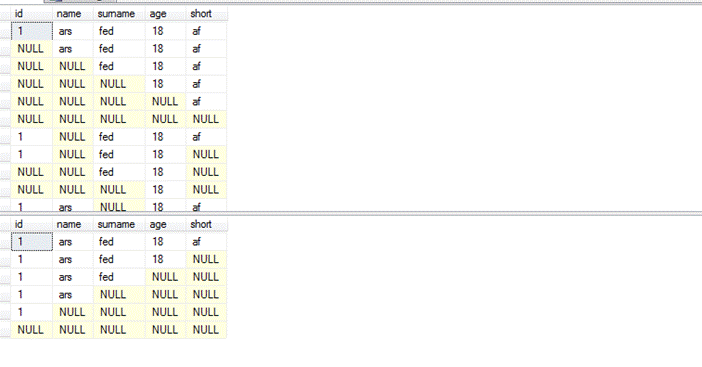 Ниже представлены различия между операторами CUBE и ROLLUP. Оператор CUBE создает результирующий набор, содержащий статистические выражения для всех комбинаций значений заданных столбцов. Оператор ROLLUP создает результирующий набор, содержащий статистические выражения иерархии значений в заданных столбцах. SELECT id, name, surname, age, short FROM people GROUP BY id, name, surname, age, short WITH cube