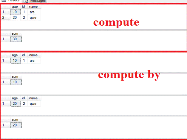 Синтаксис: SELECT age, id, name FROM people ORDER BY name COMPUTE sum(age) SELECT age, id, name FROM people ORDER BY name COMPUTE sum(age) BY name
