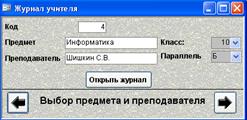 Как видно, в дочерней форме теперь отображаются только те ученики, которые соответствуют введенным в главной форме преподавателю, предмету, классу и параллели. Смените в главной форме преподавателя, или класс, или предмет. Нажмите кнопку Открыть журнал. Однако в журнале ничего не изменилось! Чтобы увидеть журнал другого класса или предмета, нужно эту форму закрыть и заново открыть. Проверьте!