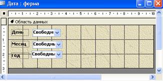 Зайдите в Макет и уберите полосы прокрутки, область выделения и кнопки перехода. Закройте конструктор, сохраните форму под именем Дата. Запустите форму и проверьте работу списков дней, месяцев и лет.