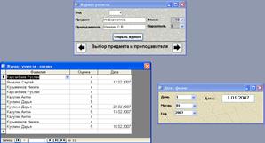Откройте форму Дата, откройте форму Журнал учителя и в ней нажмите кнопку Открыть журнал. Все три формы не должны перекрывать друг друга (см. рис.). Если это не так, разберитесь, какую форму нужно передвинуть и измените данные соответствующего макроса и вновь проверьте.
