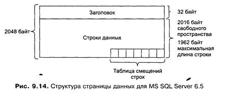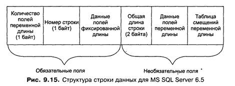 Строка данных должна полностью умещаться на странице, поэтому существуют ограничения на длину строки. Размер страницы 2048 байт, 32 байта занимает заголовок. Кроме того, в таблице смещения отводится по 2 байта на каждую строку на странице. Страницы данных, относящиеся к одной таблице, объединяются в двунаправленный список и организуют цепочки. Данные хранятся на страницах в виде строк (кортежей). Каждая строка данных кроме собственно данных хранит дополнительную форматирующую информацию. Длина строки зависит от определения полей таблицы и конкретных данных в ней. Независимо от объявления, каждая строка имеет номер и поле с количеством полей переменной длины (к ним относятся также поля, допускающие неопределенные значения NULL). Оба эти поля имеют размер по одному байту, следовательно, количество строк на странице не превышает 256, а на количество полей также существует внешнее ограничение 250 полей в одной таблице. Структура строки таблицы приведена на рис. 9.15.