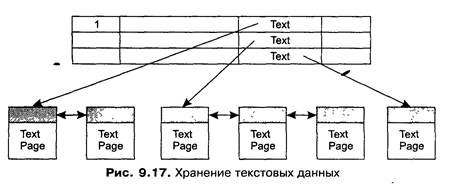Строки 543210 Рис. 9.16. Пример заполнения таблицы смещения строк Некластерный индекс хранится отдельно от данных. Текстовые страницы предназначены для хранения данных типа Next или Image. На одной текстовой странице хранятся только данные одной строки основной таблицы (см. рис. 9.17). В основной таблице в соответствующем месте хранится только ссылка на соответствующую текстовую страницу. Если неструктурированные данные не умещаются на одной странице, то они образуют цепочку взаимосвязанных страниц.