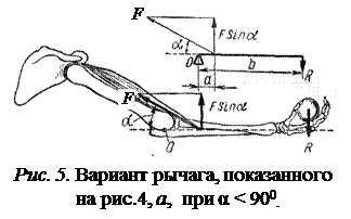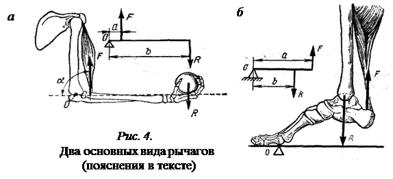 В последнее время трудности расчëта динамики реальных двигательных процессов преодолеваются применением мощных ЭВМ. Движение скелета контролируется нервно-мышечным аппаратом; здесь, как и при управлении механизмами, реализуется стремление подчинить контролю избыточные для данного движения степени свободы. Это обеспечивает целенаправленность движения в каждом конкретном случае. Само движение осуществляется системой костных рычагов, которые приводятся в движение силой тяги, возникающей при сокращении мышц. Рычагом называется твердое тело (обычно прямой стержень), имеющее ось вращения (точку опоры), к которому приложены силы, создающие моменты сил относительно этой оси. Напомним, что момент силы (относительно некоторой оси) равен произведению величины силы на еë плечо, а плечо силы – это кратчайшее расстояние от оси вращения до линии действия силы (лежащей в плоскости вращения). Сила тяги мышцы часто бывает приложена на коротком плече рычага. Поскольку для равновесия рычага необходимо равенство моментов противодействующих сил, приложенных к нему, то для уравновешивания рычага сила тяги мышцы должна быть во столько раз больше противодействующей силы, во сколько раз её плечо меньше плеча этой силы. В данном случае костные рычаги при проигрыше в силе дают выигрыш в скорости перемещения и называются рычагами скорости. Приведëм пример такого рычага: кости предплечья (рис. 4, а). Здесь точка опоры О находится в локтевом суставе; действующая сила F — сила мышц, сгибающих предплечье; сила сопротивления R — сила тяжести поддерживаемого груза, приложенная обычно к кисти, а также сила тяжести самого предплечья, приложенная в его центре масс (на рисунке не показана). Из рисунка видно, что плечо силы F равно а, а плечо силы R равно b. Условие равновесия рычага: F × a = R × b, и так как a < b, то F > R.