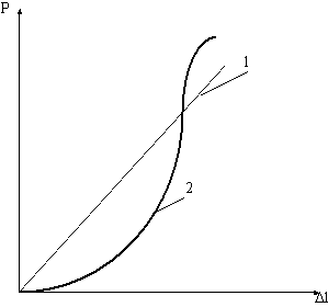 Рис.2.4 Зависимость упругой силы Р от величины деформации D l для линейной (кривая 1) и нелинейной (кривая 2) упругой системы. Прочность мышцы оценивается величиной растягивающей силы, при которой происходит разрыв мышцы. Сила, при которой происходит разрыв мышцы (в пересчете на 1 кв.мм. ее поперечного сечения), составляет от 0,1 до 0,3 н/кв.мм. Предел прочности сухожилия составляет около 50 н/кв.мм, а фасций - около 14 н/кв.мм. Релаксация (расслабление) - свойство мышцы, проявляющееся в уменьшении с течением времени силы тяги при постоянной длине мышцы. Пример: перед выпрыгиванием вверх мы приседаем. Этим мы предварительно растягиваем мышцы (ягодичные, четырехглавую бедра, трехглавую голени), которые будут выполнять рабочую функцию (создать силу тяги) в фазу отталкивания. Чем длительнее пауза между приседанием и отталкиванием, тем больше релаксируются растянутые мышцы. То есть с увеличением паузы сила тяги этих мышц будет уменьшаться, следовательно, будет уменьшаться и высота выпрыгивания, вследствие рассеивания энергии упругой деформации, накопленной в фазе приседания. Вязкость определяется наличием внутреннего трения в сократительном компоненте мышцы. Это свойство вызывает потери энергии мышечного сокращения, идущие на преодоление вязкого трения, обусловленного силами внутреннего взаимодействия между актиномиозиновыми нитями саркомера. В диапазоне укорочения мышцы потери на преодоление сил внутреннего трения больше, чем в диапазоне ее растягивания.