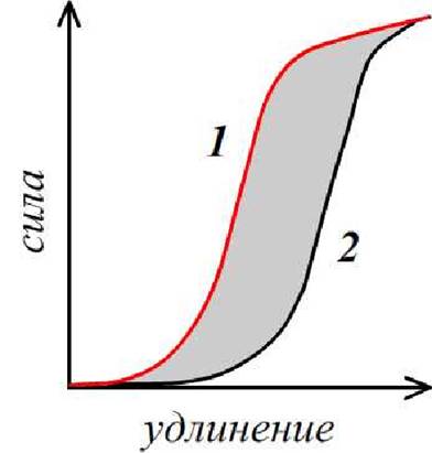 Вязкость – свойство жидкостей, газов и «пластических» тел оказывать неинерционное сопротивление перемещению одной их части относительно другой (смещение смежных слоев). При этом часть механической энергии переходит в другие виды, главным образом в тепло (В.Б. Коренберг, 1999). Это свойство сократительного аппарата мышцы вызывает потери энергии при мышечном сокращении, идущие на преодоление вязкого трения. Предполагается, что трение возникает между нитями актина и миозина при сокращении мышцы. Кроме того, трение возникает между возбужденными и невозбужденными волокнами мышцы. Поэтому, если возбуждены все волокна, трение должно быть меньше. Показано, что при сильном возбуждении мышцы, ее вязкость резко уменьшается (Г.В. Васюков,1967). Если абсолютно упругое тело (например, пружину) вначале растянуть, а затем – снять деформирующую нагрузку, то кривая «удлинение – сила» будет идентичной во время обеих фаз. Если же мы имеем дело с упруговязким материалом (мышцей), кривые окажутся неидентичными. При нагрузке (растягивании мышцы) зависимость «удлинение – сила» соответствует кривой 1. Рис.3.2.