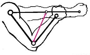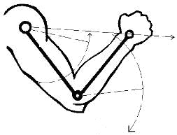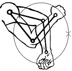На первой перемене возможны удары не только по кругу (локоть центр вращения – рис.8), но и по прямой (рис.9), что требует подключения движения плечом. Вторая перемена может использоваться как самостоятельный удар, либо в качестве дополнительного усиления. В этом случае эффективно использовать технику плети. Дело в том, что система плечо-предплечье вращается вокруг оси проходящей через общий центр масс (рис.10).
