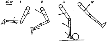 Рис. 9.15. Направление усилий, приложенных к центрам тяжести звеньев ноги спортсмена, выполняющего удар по мячу: / и // — начало движения; ///— момент соприкосновения стопы с мячом; IV— момент после удара
