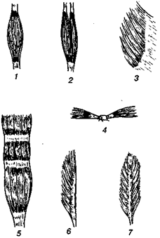 Рис. 13.3. Формы мышц: 1 — веретенообразная; 2 — двуглавая; 3 — широкая; 4 — двубрюшная; 5 — прямая (лентовидная); 6 — одноперистая; 7 — двуперистая