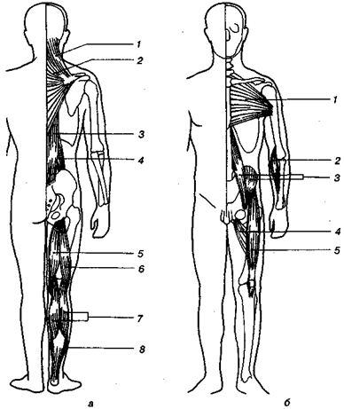 Рис. 13.4. Наиболее сильно сокращающиеся мышцы (по В. Янде, 1970): а — вид сзади: 1 —- мышца, поднимающая лопатку; 2 — трапециевидная мышца; 3 — мышца, разгибатель позвоночника; 4 — квадратная мышца спины; 5 — полусухожильная мышца; 6 — двуглавая мышца бедра; 7 — икроножная мышца; 8 — камбаловидная мышца, б — вид спереди: 1 — большая грудная мышца; 2 — сгибатель руки и пальца; 3 — подвздошно-поясничная мышца; 4 — приводящие мышцы; 5 — прямая мышца бедра