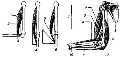 Рис. 13.5. Схема действия мышц на костные рычаги: 1 — действующая мышца (двуглавая); 2 — вращательное действие; 3 — сгибание в суставе; 4 — разгибание в суставе; 5 — сесамовидная кость; 6 — распределение силы при наличии сесамовидной кости; 7— сгибатели руки (синергисты): а — двуглавая мышца; б— сгибатель (плечелучевая мышца); в — мышца лучевой сгибатель; 8 — лопатка; 9 — плечевая кость; 10 — лучевая кость; 11 — локтевая кость; 12 — разгибатель (антагонист), трехглавая мышца плеча