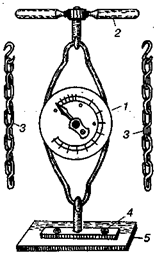 Рис. 16.39. Динамометр становой: 1 — динамометр, 2 — рукоятка с крюком, 3 — цепь, 4 — планка с крюком, 5 — доска для закрепления планки с крюком