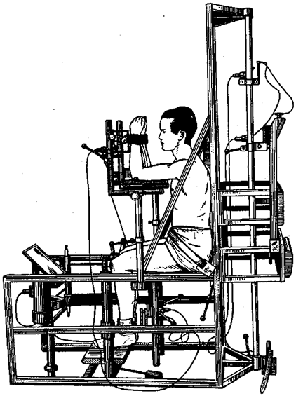 Рис. 16.40. Динамометрическая установка для измерения силы разных мышечных групп Мужчины достигают максимума изометрической силы в возрасте около 30 лет, потом сила уменьшается. Этот процесс идет быстрее в крупных мышцах нижних конечностей и туловища. Сила рук сохраняется дольше. В таблице 16.2 приведены показатели силы различных мышечных групп, полученные при обследовании около 600 человек (средний рост мужчин 171 см, женщин — 167 см).