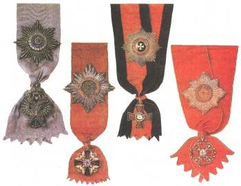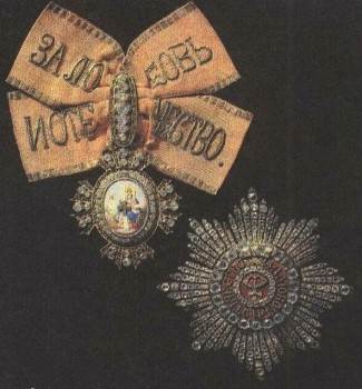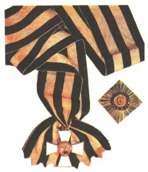 До реформ Петра I (см. Петр I и реформы первой четверти 18 в.) на Руси за заслуги жаловали не только чином, званием или чем-то ценным (оружием, деньгами, дорогой одеждой), но и особыми наградами за воинские отличия — «золотыми» (монетовидными) знаками, которые пришивались к одежде; поэтому их можно считать предшественниками наградных медалей. Между тем в Европе к концу 17 в. уже сложился обычай награждения государственными наградами — орденами, ведущими свою родословную от знаков отличия рыцарских военно-религиозных организаций — орденов. Перенося на русскую почву западноевропейский опыт, Петр I в 1698 г. учредил первый российский орден — Святого Апостола Андрея Первозванного, высшую награду России. В 17 И г. Петр учреждает второй российский орден — Святой Великомученицы Екатерины — в честь заслуг его супруги Екатерины, отдавшей в неудачном Прутском походе для подкупа турок свои драгоценности. В самом конце жизни Петр думал об учреждении военного ордена Святого Александра Невского. Но первые знаки его вручала уже Екатерина I в 1725 г., и вышло так, что этот орден получали за успехи и в военной, и в гражданской службе.Наградой только за боевые отличия стал с 1769 г. Военный орден Святого Великомученика и Победоносца Георгия. Он имел 4 степени. Белые эмалевые кресты на черно-желтой полосатой ленте и характерные квадратные звезды были почетнейшими знаками отличия русской армии. За полтора века существования этого ордена только четверо — М. И. Кутузов, М. Б. Барклай-де-Толли, И. Ф. Паскевич и И. И. Дибич — стали его полными кавалерами, а право носить на ленте через правое плечо крест 1-й степени получили лишь 25 человек. К ордену полагалось «золотое» оружие (шпага или сабля — по роду войск награжденного), на котором крепился темляк из орденской ленты и знак ордена Св. Георгия. К георгиевским наградам относились и знаки отличия для воинских коллективов — знамена и штандарты, а также серебряные трубы и рожки. Для отличившихся нижних чинов в 1807 г. учреждается Знак отличия Военного ордена на георгиевской ленте. Он имел одну степень, но в 1856 г., как и орден, был разделен на четыре. Этот «солдатский орден» в 1913 г. переименовали в Георгиевский крест.