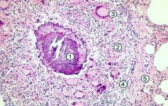 Рис. 31. Милиарная туберкулезная гранулема. В центре расположен участок казеозного некроза с обызвествлением (1 – участок обызвествленного казеозного некроза); 2 – зона эпителиоидных клеток; 3- гигантские клетки Пирогова-Лангханса; 4 – зона лимфоидных клеток, представленная лимфоцитами, плпзмоцитами; 5 – формирующаяся соединительнотканная капсула При лобарной пневмонии поражаются целые доли легкого или его обширные участки. Образуются эти участки вследствие слияния отдельных, пораженных туберкулезом долек в одном сплошном поле. Пораженные участки легкого плотные, бугристые, неравномерно окрашенные: серо-белые, желтовато-белые, разделенные прослойками соединительной ткани. При лобулярных и лобарных пневмониях происходит усиленная миграция лейкоцитов из сохранившихся сосудов. Лейкоциты своими ферментами разрушают (разжижают) казеозную массу и превращают ее в гноевидное полужидкое вещество, которое частично рассасывается, а его большая часть удаляется при кашле. После удаления казеозных масс образуются полости, называемые кавернами. В целом, при туберкулезе легких нередко обнаруживают различные по величине туберкулы и очаги пневмонии. Это объясняется неодновременным возникновением этих поражений и разной быстротой их развития, туберкулезный процесс протекает волнообразно: периоды альтерации сменяются периодами пролиферации и заживления.