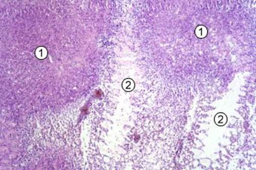 Рис. 32. Туберкулезный очаг в легком лошади. Очаг молодой, поэтому в центре поражения видна масса лейкоцитов, чьи ядра придают этому участку фиолетовый цвет, по периферии – разрастающаяся фиброзная ткань, окрашенная в нежно розовый цвет. По периферии – выраженная артериальная гиперемия. Сап — инфекционное заболевание однокопытных животных, вызывается P. mallei и характеризуется специфическим воспалением органов с образованием гранулем. Животные инфицируются возбудителем алиментарным путем, реже через конъюнктиву и слизистую оболочку носа (когда на них попадают капельки гноя, содержащие сапные микробы), и через кожу. В естественных условиях первичные поражения возникают в легких, куда сапные микробы попадают с кровью. Вокруг микробов скапливаются нейтрофильные лейкоциты, соседние альвеолы заполняются серозно-фибринозным экссудатом с лейкоцитами. Начинают размножаться мезенхимальные клетки с образованием зон эпителиоидных, лимфоидных клеток. Центральная часть очага быстро подвергается некрозу, ядра лейкоцитов распадаются на глыбки (кариорексис). В дальнейшем, некротический центр расширяется за счет распада прилегающих эпителиоидных клеток и тканей органа. Макроскопически сформировавшийся сапный узелок округлой формы, плотной консистенции. В легких сапные поражения могут быть в виде милиарных, крупноочаговых узелков и в виде сапной бронхопневмонии. Эти формы поражения сходны с туберкулезными поражениями.