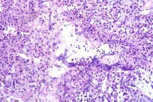 Рис. 37. Гифы гриба Aspergillus sp в микотической гранулеме, расположенной в легком
