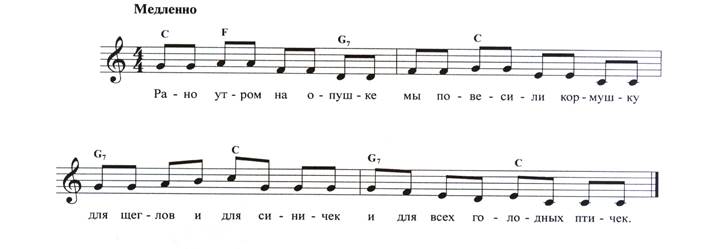 Занятие № 11 (2 неделя) Цель: развитие эмпатии, коммуникативных навыков, слухового внимания, чувства темпа и ритма, координации движений и музыки. Музыкальный материал: Упражнение «Передача платочка», музыка Т. П. Ломовой Можно использовать любую музыку в умеренном темпе с четкой и ясной фразировкой Ход занятия: педагог вместе с детьми читает стихотворение: Ты катись, веселый мячик, Быстро, быстро по рукам, У кого веселый мячик, Тот станцует танец нам. Дети, стоя в кругу, передают мяч соседу справа (на сильную долю такта исполняемого музыкального произведения). У кого в конце окажется мяч, тот показывает изученные ранее танцевальные движения, согласуя их с темпом и ритмом музыкального сопровождения, а остальные повторяют за ним. Занятие № 12, 13 (3-4 неделя) Цель: развитие, слухового внимания, чувства темпа и ритма Логопедическая распевка «Кормушка» Рано утром на опушке мы повесили кормушку, Для щеглов и для синичек и для всех голодных птичек.