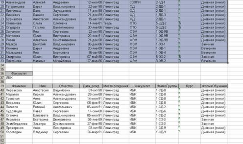 Для того, чтобы применить расширенный фильтр, необходимо предварительно подготовить данные. Решим для примера следующую задачу: "Отобрать всех студентов с одного факультета". Технология выполнения