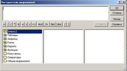 Рис.5. Окно построителя выражений Рассмотрим пример создания вычисляемого поля ФИО в котором будут объединены данные из трех полей – Фамилии, Имени, Отчества. 1.Создаем запрос на выборку; 2.Добавляем таблицу "Студент"; 3.В пустом столбце вводим название поля ФИО и ставим двоеточие; 4.Вызываем построитель выражений и строим следующее выражение: ФИО: [Студент]![Фамилия] & " " & [Студент]![Имя] & " " & [Студент]![Отчество]
