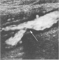 в противоположную сторону и удерживание ее в этой позиции (тест Адсона); у больных, страдающих реберно-ключич-ным синдромом, — при отведении руки кзади и книзу, а у больных с синдромом Райта — при поднимании и отведении больной руки, а также запрокидывании ее на затылок. Постоянная травматиза-ция артерии и нервов приводит к рубцо-вым изменениям вокруг этих анатомических образований и выраженным функциональным расстройствам. Симптомы болезни редко возникают в детском и подростковом возрасте. Даже шейное ребро не причиняет заметных расстройств у юношей. Это дает основание считать, что изменения во взаимоотношении структур между ключицей и верхней частью грудной клетки, развивающиеся постепенно, с возрастом являются основной причиной заболевания. Симптомы болезни вызываются не столько периодически возникающими расстройствами кровоснабжения верхней конечности, сколько транзиторным сдавлением одного или нескольких стволов плечевого сплетения. У ряда больных развиваются заметные трофические нарушения на пораженной стороне. Правильная оценка клинической картины, результатов проб с изменением положения конечности, инструментальные исследования позволяют провести дифференциальный диагноз указанных синдромов с болезнью Рейно. Среди неинвазивных методов исследования, используемых в диагностике поражений ветвей дуги аорты, наибольшей информативностью обладает ультразвуковая допплерография, при помощи которой определяют направление и скорость кровотока, наличие перетока из одного бассейна в другой. При дуплексном сканировании с помощью современных ультразвуковых приборов удается с большой точностью установить локализацию и протяженность патологических изменений, степень поражения артерий — окклюзия, стеноз, характер патологического процесса — атеросклероз, аорто-артериит (рис. 18.9). При планировании хирургических вмешательств выполняют панартериографию дуги аорты по Сельдингеру или селективную артериографию ее ветвей. Традиционную рентгеноконтрастную ангиографию можно заменить КТ- или МР-ангиографией.