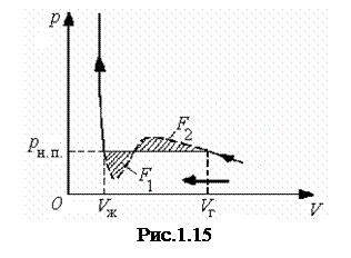 В п. 1.14 приведено уравнение (1.68), предложенное Ван-дер-Ваальсом для описания состояния газов при больших плотностях. На рис. 1.14 изображены изотермы Ван-дер-Ваальса, т.е. кривые, описываемые уравнением (1.68), для нескольких температур. Характерным для изотерм является то, что для температур, не превышающих значение Т кр, у кривых имеется S -образный завиток, в области которого за