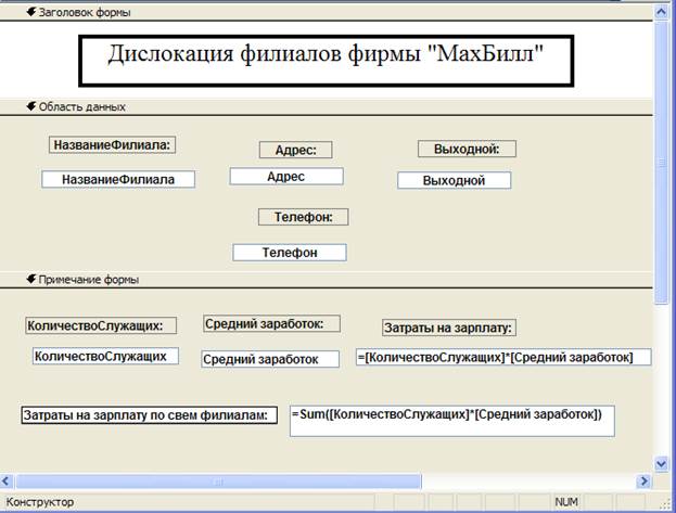 Рис. 8. Окно конструктора форм 4. В области Заголовка форм поместите название формы "Дислокация филиалов фирмы МахБилл ". 5. В области данных разместите поля: Название филиала, Часы работы, Выходной день, Адрес, Телефон, Количество служащих, Средний заработок так, как показано на рис. 9. Шифр, цвет линии и фона, заливку и новые названия полей можно установить с помощью свойств элементов. 6. Вставьте в форму новое поле, используя соответствующий элемент на панели элементов. Это будет вычисляемое поле. Организовать его можно непосредственным вводом формулы, либо с помощью построителя выражений. Не забывайте выравнивать элементы в форме, чтобы вид её был опрятным. 7. В Примечании формы поместите новое вычисляемое поле: общая сумма затрат на зарплату сотрудникам по всем филиалам фирмы. 8. Просмотрите созданную форму. Внесите исправления, если это необходимо. Сохраните форму. Закройте файл.