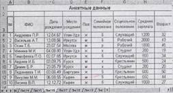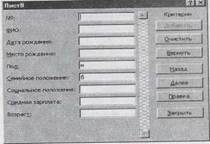 Цель работы. Научиться использовать окно диалога Форма для ввода и выбора данных. Теория. База данных - это совокупность связанной информации, объединенной вместе по определенному признаку. Основное назначение базы данных - быстрый поиск содержащейся в ней информации по заданному критерию (требованию). Существует несколько типов баз данных в зависимости от структуры хранения информации. Самой простой и распространенной является реляционная база данных со структурой в виде таблиц. Каждая строка таблицы носит название записи базы данных, а каждый элемент записи - поле записи. Если база данных - это часть имеющейся таблицы Excel, то ее нужно отделить от других частей пустой строкой и пустым столбцом. Теоретически максимальные размеры базы данных в Excel -16383 записи (одна строка под заголовки столбцов - имена полей) и в каждой записи 256 полей. Практически зависит от объема памяти компьютера. Создание базы данных. В первую очередь в таблицу нужно ввести заголовки столбцов, которые в базе будут использоваться в качестве имен полей. Далее вводятся сами данные. Для этого существуют два способа: 1- Таблица заполняется данными обычным способом, т.е. построчно поле за полем. 2- Посредством команды Данные, Форма, которая отображает на экране Форму в виде окна диалога. В этом окне содержатся: А)имена полей базы данных, расположенные горизонтально, т.е. каждое в отдельной строке; Порядок выполняемых действий командой Форма: 1. Задать заголовки столбцов таблицы. 2. Установить курсор в начальную ячейку, куда будут заноситься данные. 3. Выбрать команду Данные, Форма. 4. В появившемся окне диалога в виде формы ( рис. 2) занести данные первой строки таблицы (это будет первая запись базы данных). 5. Ввод закончить нажатием кнопки Добавить, что означает ввод записи в таблицу и переход к вводу следующей записи. 6. Таким образом ввести все записи и закрыть форму кнопкой Закрыть. Окно диалога формы, кроме ввода, позволяет просмотр и редактирование записей в базе данных, а также добавление новых и удаление существующих записей. Кроме того, с помощью формы можно осуществить поиск конкретных записей, используя критерии. Форма может содержать вычисляемые поля, значения которых автоматически вычисляются на основе информации в базе данных. Нельзя непосредственно ввести или изменить значения вычисляемых полей, поэтому в режиме редактирования эти поля не отображаются. Помимо полей форма содержит ряд кнопок. 1. Добавить - ввод в базу новой записи, т.е. после ввода очередной записи и для перехода к вводу следующей нужно щелкнуть по этой кнопке. 2. Удалить - удаляет текущую запись. При этом нижние записи смещаются вверх на одну запись. Удаленные записи не могут быть восстановлены. 3. Вернуть - восстановление содержимого полей текущей записи после вменения, если эти изменения не нужны. Восстановление возможно, если не было перехода к новой записи после изменения. 4. Назад - переход к предыдущей записи. 5. Далее - переход к следующей записи. 6. Критерии - позволяет ограничить количество отображаемых записей в форме, для чего задаются условия. 7. Закрыть - закрывает форму. Просмотр или редактирование данных в небольшой базе можно осуществить непосредственно в таблице, если же база имеет большой объем да еще к тому же нужно просмотреть или отредактировать не все данные удобно воспользов