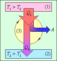 1 – нагреватель; 2 – холодильник; 3 – рабочее тело, совершающее круговой процесс. Q1 > 0, A > 0, Q2 < 0; T1 > T2. Общее выражение для КПД