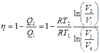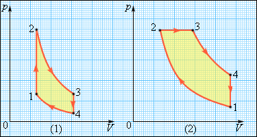 В применяемых в технике двигателях используются различные круговые процессы. Рабочим телом является смесь паров бензина или дизельного топлива с воздухом. Цикл карбюраторного двигателя внутреннего сгорания состоит из двух изохор (1–2, 3–4) и двух адиабат (2–3, 4–1). Дизельный двигатель внутреннего сгорания работает по циклу, состоящему из двух адиабат (1–2, 3–4), одной изобары (2–3) и одной изохоры (4–1). Реальный КПД карбюраторного двигателя ~ 30%, у дизельного двигателя ~ 40 %.