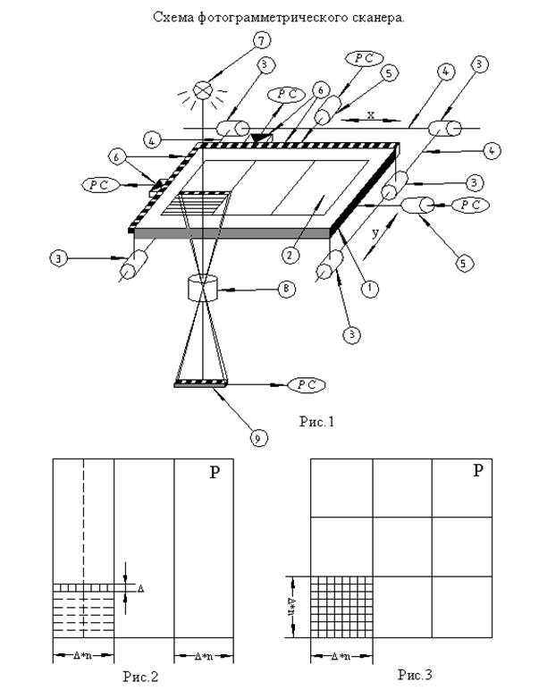 Фотограмметрические сканеры, как и обычные сканеры, предназначены для преобразования аналоговых фотоснимков в цифровые изображения. В фотограмметрических сканерах в отличие от обычных с высокой (2-3 мкм.) точностью выполняется позиционирование элементов цифрового изображения, что обеспечивает высокую геометрическую точность цифрового изображения. Сканер состоит из снимкодержателя – 1, на который устанавливается снимок – 2. Снимкодержатель укреплен на каретках – 3, с помощью которых он может перемещаться по направлению осей х и у. Перемещение снимкодержателя осуществляется с помощью сервоприводов – 5, управляемых компьютером. Положение снимкодержателя фиксируется датчиками координат х и у - 6, которые связаны посредством интерфейсов с компьютером. Изображение участка снимка освещаемое источником света – 7, проектируется с помощью объектива – 8 на линейку - 9 или матрицу светоприемных элементов (обычно линейку или матрицу ПЗС). В некоторых сканерах используют несколько перекрывающихся между собой параллельных линеек ПЗС. Сканирование снимка сканером с линейкой ПЗС производится следующим образом. Снимкодержатель со снимком перемещается с помощью сервопривода с постоянной скоростью вдоль оси у сканера. Изображение строки снимка формируется объективом в плоскости линейки ПЗС. Светоприемные элементы линейки ПЗС преобразуют световой поток в электрический сигналы, интенсивность которых зависят от интенсивности светового потока, попавшего на светоприемные элементы. Электрические сигналы преобразуются в цифровую форму. Таким образом формируется строка цифрового изображения полосы снимка (рис.2). Строки цифрового изображения формируются через временные интервалы соответствующие перемещению линейки на расстояние равное проекции ширины линейки ПЗС на снимке - ∆. После формирования цифрового изображения полосы снимкодержатель перемещается по оси х на величину проекции длины линейки на снимок - ∆*n (n – число элементов в линейке ПЗС) и повторяется процесс формирования цифрового изображения следующей полосы снимка. Из цифровых изображений полос формируется общее цифровое изображение снимка. В сканерах с матрицей ПЗС общее цифровое изображение снимка формируется из цифровых изображений участков снимка формируемых матрицей ПЗС. Каждый участок цифрового изображения формируется при неподвижном снимкодержателе. Переход на смежный участок снимка производится перемещением снимкодержателя соответственно по осям х и у на величину проекции на снимке длины или ширины матрицы (рис. 3).