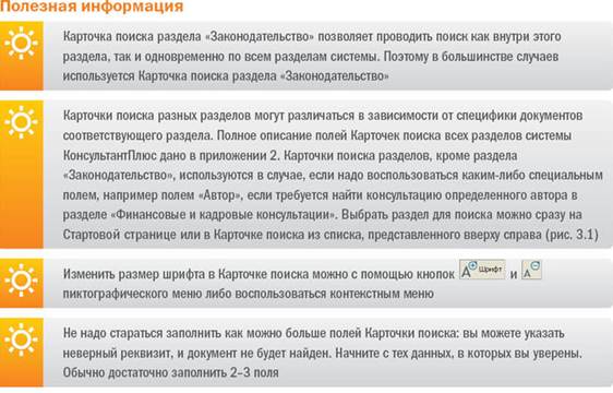Использование Быстрого поиска и Путеводителей КонсультантПлюс — как правило, наиболее быстрый и эффективный путь получения необходимой информации в системе. КонсультантПлюс предоставляет также широкие возможности получения информации и традиционными способами: через правовые акты, консультации, судебную практику и т.д. Для этого в КонсультантПлюс имеется целый спектр различных инструментов, среди которых Карточка поиска, Правовой навигатор и др. Все они доступны сразу при входе в систему со Стартовой страницы, а также в дальнейшем из любого места системы через Панель быстрого доступа. Карточку поиска можно использовать для поиска документа, если известны какие-либо его реквизиты (номер документа, вид документа, принявший орган, дата принятия) или же фразы и даже отдельные слова из его названия или текста. Известные данные о документе можно задать в соответствующих полях Карточки поиска (рис. 3.1). Если реквизиты известны приблизительно, то следует задать несколько возможных значений, соединив их логическим условием «ИЛИ» (для поля «Дата» задать диапазон дат). Очевидно, что знание точных реквизитов документа позволяет найти его без особого труда. В нижней части окна указывается количество документов, удовлетворяющих условиям поиска (рис. 3.1). Пока Карточка поиска не заполнена, здесь будет указано общее число документов в информационных банках системы КонсультантПлюс, установленных на вашем компьютере.