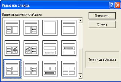 Рисунок 3 Окно Разметка слайда с набором авторазметок После создания слайда на базе авторазметки вам остается лишь щелкать на место заполнителях этих объектов и вводить необходимую информацию. На значках авторазметок заголовки показаны серой полосой, маркированные списки - прямоугольником с тремя пунктами. Диаграммы представлены маленькой гистограммой, рисунки - портретом человечка. Здесь же можно найти миниатюры организационных диаграмм и видеоклипов. В слайд можно добавить заметки, которые помогут докладчику. На странице заметок всегда присутствуют два объекта: сам слайд в верхней части страницы и заметки в ее нижней части. Эти заметки не видны на экране в режиме просмотра презентации, они не выводятся на печать вместе со слайдом. Однако, проводя электронную презентацию в локальной сети, докладчик может читать заметки на экране своего компьютера. Кроме того, страницы заметок можно распечатать и пользоваться ими во время доклада. В режиме слайдов отдельный слайд занимает все окно презентации. Это как бы увеличенный вариант области слайда обычного режима просмотра. В режиме слайдов удобно редактировать отдельные объекты, добавлять рисунки и текстовые комментарии. PowerPoint позволяет оперативно изменять разметку любого слайда. Если вы решили добавить на слайд еще один список или дополнительный рисунок, бывает достаточно просто сменить авторазметку, хотя иногда приходится добавлять недостающие объекты вручную. Для перехода от слайда к слайду пользуйтесь вертикальной полосой прокрутки. Если выбранный масштаб не позволяет увидеть весь слайд целиком, кнопки и ползунок полосы прокрутки обеспечивают возможность перемещений как по слайду, так и между слайдами вперед и назад в пределах всей последовательности слайдов данной презентации. При перетаскивании мышью ползунка полосы прокрутки рядом с ним появляется номер и заголовок текущего слайда. Режим структуры похож на обычный, но область структуры презентации увеличена, а области слайда и заметок уменьшены. Этот режим в основном предназначен для работы над текстом. Он позволяет сконцентрироваться на словесном изложении идей, подобрать оптимальную последовательность подачи материала. Дизайн и другие элементы оформления, как правило, прорабатываются в других режимах просмотра, хотя область слайда позволяет работать с конкретными объектами и в режиме структуры. Для разработки содержания презентации предназначена специальная панель инструментов Структура. Она помогает перемещать слайды презентации, изменять уровень структурных элементов, сворачивать и разворачивать вложенные списки пунктов. PowerPoint предоставляет возможность простого и оперативного создания итогового слайда на основе последовательности выбранных слайдов. В итоговом слайде формируется маркированный список заголовков каждого слайда серии. Итоговый слайд можно поместить как до, так и после обобщаемой им совокупности. Он может играть роль аннотации доклада. Мастер автосодержания предлагает достаточное количество хорошо отработанных макетов презентаций, среди которых можно найти варианты, раскрывающие следующие темы: · доклады по общим вопросам; · доклады по служебным вопросам; · описания проектов; · отчеты о продажах и маркетинге; · сообщения в стиле Карнеги. На основе базовой структуры, сф