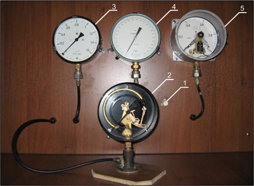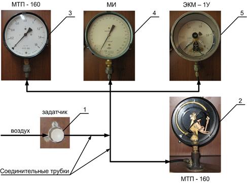 Схема лабораторного стенда представлена на рис. 1. Стенд состоит из редуктора, задающего величину давления(1), манометра, показывающего работу пружинного измерительного механизма (2), поверяемого пружинного манометра МТП-160 (3), образцового манометра (4), и поверяемого электроконтактного манометра ЭКМ – 1У (5). Поверка средств измерений – установление пригодности средства измерений к применению на основании экспериментально определяемых метрологических характеристик и контроля их соответствия установленным требованиям. Средство измерения признается пригодным к дальнейшей эксплуатации в том случае если максимальные реальные погрешность и вариация поверяемого прибора не превышают допустимых значений, обусловленных классом точности средства измерения. Калибровка средств измерений – совокупность операций, выполняемых с целью определения и подтверждения действительных значений метрологических характеристик и пригодности к применению средства измерений, не подлежащего государственному контролю и надзору Для создания давления используется источник давления, представленный компрессором, нагнетающим давление воздуха. Из компрессора через задатчик (поз. 1) воздух подается на поверяемые датчики и эталонный датчик давления. (Рис. 2). Манометры в схеме подключены параллельно. В качестве поверяемых датчиков используются: 1) Манометр технический пружинный с верхним пределом измерения 1,6 кгс/см2 (МТП - 160). Класс точности поверяемого манометра 1,5 (поз. 3). Для наглядности работы пружинных манометров представлен датчик МТП – 160 без верхней крышки (поз. 2). 2) Электроконтактный манометр с верхним пределом измерения 1 кгс/см2 и одной уставкой (перемещаемым по шкале контактом) (ЭКМ – 1У). Класс точности 1,5. (поз. 5) В качестве эталонного датчика используется Манометр измерительный (МИ) (поз. 4) с верхним пределом измерения 1 кгс/см2 и классом точности 0,4.