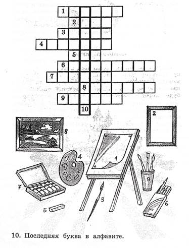 № 2. Перед тобой кроссворд. Художник, создавая свои произведения искусства, использует уже хорошо знакомые вам предметы. Отгадай кроссворд и ты узнаешь, где работает художник.