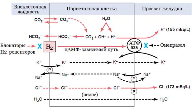 Рис. 24. Секреция HCl париетальной (обкладочной клеткой) желудка. Следует обратить внимание, что хлор секретируется независимо от водорода. Применение блокаторов протонной помпы или блокаторов H2-рецепторов снижают кислотность желудочного сока, но не снижают его секрецию в целом и не могут предотвратить потерю хлоридов и воды. Согласно Arthur C. Guyton, M.D., John E. Hall, Ph.D. Textbook of Medical Physiology 11th ed. 2006 с изменениями и дополнениями.