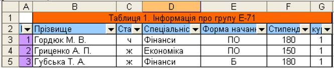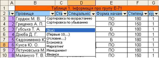 Можна вибрати будь-яку зі спеціальностей, що потім відобразяться в списку, а всі інші будуть приховані. Наприклад, якщо вибрати спеціальність маркетинг, то одержимо список, що містить студентів спеціальності маркетинг зі списку
