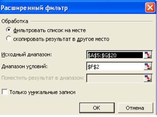 Розширений фільтр – це фільтр, що дозволяє задати складні критерії для пошуку і при необхідності дозволяє задати відображення результатів фільтрації в окремій області таблиці. При використанні розширеного фільтру критерії фільтрації задаються на робочому листі. Перевага даного методу в тому, що користувач завжди має чітке представлення про критерії відбору. Щоб задати розширений фільтр, треба задати початковий діапазон, діапазон критеріїв, та де фільтрувати список (безпосередньо в таблиці, або розмістити результат фільтрації в окрему частину таблиці). При записі критеріїв знак дорівнює не записують, бо тоді програма сприймає критерій як формулу.