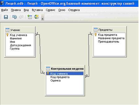 Установка связей между таблицами Отдельные таблицы БД могут быть связаны между собой. Связь между таблицами определяет тип отношения между полями. Как правило, связывают ключевое поле одной таблицы с соответствующим ему полем другой таблицы, которое называют полем внешнего ключа. Связанные поля могут иметь разные имена, однако у них должны быть одинаковые типы и одинаковые значения свойств. При наличии связи между таблицами Base будет автоматически выбирать связанные данные из таблиц в отчетах, запросах и формах. I. Чтобы связать таблицы в меню Сервис выберем команду Связи … В диалоговом окне Добавление таблицы пометим последовательно каждую из таблиц и нажмем кнопку Добавить. Закроем диалоговое окно. Перетащим мышью поле «Код ученика» из таблицы «Ученик» на место аналогичного поля в таблице «Контрольная неделя». Поле «Код предмета» из таблицы «Предметы» перетащим на место поля «Код предмета» из таблицы «Контрольная неделя».