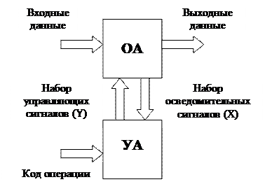 Согласно модели академика В.М. Глушкова цифровой автомат (ЦА) как устройство для автоматической обработки цифровой информации по заданным алгоритмам представляет собой совокупность операционного автомата (ОА) и управляющего автомата (УА).