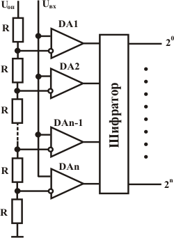 Чаще всего в качестве пороговых устройств параллельного АЦП используются интегральные компараторы. Схема типичного АЦП параллельного типа приведена на рисунке 4.