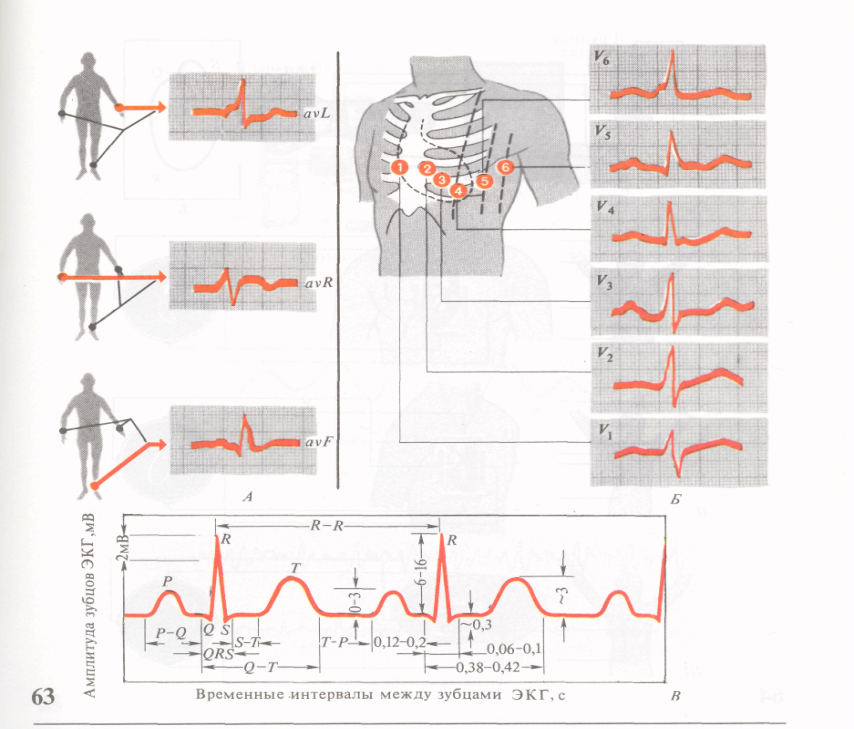 • Предупредить пациента, что регистрация ЭКГ проводится после 10-15 минутного отдыха, через 2 и более часов после еды. • Установить электрокардиограф в удобное для медсестры положение. • Заправить электрокардиограф диаграммной лентой. • Выполнить заземление аппарата к контуру кабинета или к линии центрального отопления в нетрадиционных условиях. • Предложить пациенту раздеться по пояс, обнажить голени. • Лечь на кушетку в положение на спине с вытянутыми вдоль туловища руками. • Смочить прокладки в 5-10% растворе натрия хлорида или в воде и наложить их на уровне нижней трети внутренней поверхности предплечий и голеней. • На прокладки наложить и закрепить эластичной лентой электроды. • Соединить электроды с проводами аппарата, имеющими цвет: ü красный - с правой верхней конечностью ü желтый – с левой верхней конечностью. ü зеленый - с левой нижней конечностью. ü черный - с правой нижней конечностью («земля»). • Включить электрокардиограф в сеть. • Установить регулятором перо на середину поля записи. • Выключить успокоение, кратковременно нажав на кнопку включения успокоения. • Записать два-три калибровочных сигнала, кратковременно нажимая на кнопку калибровки «MV». • Выключить протяжку ленты, кратковременно нажав на кнопку включения скорости «50» • Указать над калибровочным сигналом Ф.И.О., возраст, дату и время записи ЭКГ. • Установить переключатель отведений в положение «1» и записать 3-4 цикла электрокардиограммы. • Переключить последовательно кнопки на II, III, III вдох АVR, АVL, АVF и производить запись. • Приступить к записи грудных отведений с помощью грудного электрода • Смочить предварительно волосистую часть груди водно-мыльным раствором. • Установить грудной электрод последовательно в точки, производя запись: • 1 - у места приклепления III – IV ребра к грудине справа. • 2 - аналогично слева. • 3 - посередине между 2 и 4 отведением • 4 - на верхушке сердца (в 5 межреберье). • 5 - по передне-подмышечной линии (в 5 межреберье). • 6 - по среднеподмышечной линии (в 5 межреберье). АНАЛИЗ ЭЛЕКТРОКАРДИОГРАММЫ Электрокардиограмма– графическая запись электрических потенциалов сердца на миллиметровой бумаге, представляющая собой изоэлектрическую линию с зубцами Р, Q, R, S, Т. Цена одной маленькой клеточки равна 0,02 сек. по ширине (при скорости записи 50 мм/сек.), по высоте—1 мм. Большая клеточка состоит из 5 малых, соответственно равна 0,1 сек. и 5 мм. Для определения ЧСС по ЭКГ измеряют продолжительность интервалов R-R (отражение деятельности одного сердечного цикла, например, 0, 84 сек.). Далее, 60 сек. разделив на полученное число, получаем ЧСС– 72 в 1 мин. Для удобства расчета ЧСС можно пользоваться таблицей.