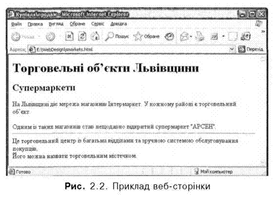 · COLOR=значення — колір шрифту. Як значення кольору можна використовувати назви кольорів англійською мовою, такі як red, green, blue тощо, або шістнадцяткові значення (записані в шістнадцятковій системі числення), що починаються з символу # і послідовно задають червоний, зелений та синій кольори, які мають бути змішані для отримання потрібного. Наприклад, #FF0000, #008000, #0000FF тощо. Для оформлення сайту зазвичай використовують набір кольорів, який називають безпечною палітрою. Він складається з 216 елементів. Особливістю безпечних кольорів є те, що вони не змінюються у разі відображення різними браузерами або на різних моніторах, тобто ця палітра забезпечує найточнішу передачу на різних моніторах того, що задумав веб-дизайнер. Якщо будь-яка з трьох складових шістнадцяткового значення відрізняється від 00, 33, 66, 99, СС чи FF, то колір не є безпечним. Значення атрибутів SIZE та COLOR можна записувати без лапок. Гарнітуру, розмір та колір шрифту для фрагмента тексту задають за допомогою тегу <FONT АТРИБУТИ>Текст<^ОКТ>. Атрибути цього тегу такі самі, як у тегу <BASEFONT>, за винятком атрибута SIZE: його значення зі знаком мінус (або плюс) означає, що розмір шрифту буде зменшено (чи збільшено) на відповідну величину відносно заданого за умовчанням або у тегу <BASEFONT>. Значення без знака задає абсолютний розмір шрифту. Є й інші теги, які можна застосовувати для зміни параметрів тексту. · <ВIG>Тєкст</ВIG> — збільшення розміру шрифту. Розмір символів тексту збільшується на одиницю відносно поточного рівня. · <SMALL>Teкст</SMALL> — зменшення розміру шрифту. Розмір символів зменшується на одиницю відносно поточного рівня. · <ЕМ>Текст</ЕМ> — виділення важливих фрагментів тексту. Текст відображатиметься курсивом. · <DEL>Teкст</DEL> — створення перекресленого тексту. Текст буде перекреслено горизонтальною лінією. Цікавого оформлення веб-сторінці надає пара тегів <MARQUEE> та </MARQUEE> — вони додають до веб-сторінки «рухомий рядок» із тексту, розташованого між ними. Вправа 2.1 Створимо HTML-документ за допомогою найпростішого текстового редактора. 1. Відкрийте текстовий редактор Блокнот (Notepad). 2. Для створення HTML-документа наберіть такий текст: <HTML> <HEAD> <ТITLE>Купівля\продаж</ТІТLЕ> </HEAD> <BODY> <Н1>Торговельні об'єкти Львівщини</Н 1> <Н2>Супєрмаркети</Н2> <Р>На Львівщині діє мережа магазинів Інтермаркет. У кожному районі є торговельний об'єкт.<Р>Одним із таких магазинів став нещодавно відкритий супермаркет "АРСЕН". <HR> Це торговельний центр із багатьма відділами та зручною системою обслуговування покупців.<ВR>Його можна назвати торговельним містечком. </BODY> <HTML> 3. Збережіть файл на жорсткому диску у створеній заздалегідь папці, назвавши його, наприклад, 1.html. Закрийте текстовий редактор. 4. Запустіть браузер Internet Explorer та відкрийте файл 1.html. Перегляньте отриманий результат. 5. Проаналізуйте, як відтворено веб-сторінку. Якщо потрібно внести зміни, виберіть команду Перегляд HTML-коду в меню Вигляд. Збережіть зміни та оновіть веб-сторінку за допомогою клавіші F5 або кнопки Оновити панелі інструментів. На рис. 2.2 показано, як буде відтворено цей документ у вікні браузера Internet Explorer.