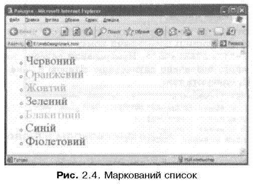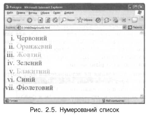 Приклад 2.2. Нумерований список, в якому для позначення елементів використовують малі римські цифри <HTML> <TITLE>Райдуга</TITLE> <BODY> <BASEFONT SIZE=6> <OL TYPE=i> <LI><FONT COLOR=red>Червоний</FONT></LI> <LI><FONT C0L0R=orange>0ранжевий</F0NT></LI> <LI><FONT COLOR=yellow>Жoвтий</FONT></LI> <LI><FONT COLOR=green>Зелений</FONT></LI> <LI><FONT COLOR=lightblue>Блакитний</FONT></LI> <LI><FONT COLOR=blue>Синій</FONT></LI> <LI><FONT COLOR=darkmagenta>Фіолетовий</FONT></LI> </OL> </BODY> </HTML> Ha рис. 2.5 показаний вигляд цього документа у вікні браузера Internet Explorer.