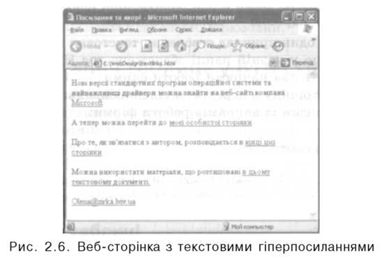 Зверніть увагу на те, що за допомогою тегу <BASEFONT> для всього документа призначено розмір шрифту 6, а за допомогою тегів <FONT> визначено колір шрифту для кожного елемента списку. Текстові гіперпосилання Гіперпосилання — це вказівка для браузера, до якого об'єкта у межах або поза межами HTML-документа він має звернутися. За допомогою гіперпосилань користувачі можуть переходити з однієї веб-сторінки на іншу, завантажувати файли тощо. Як гіперпосилання може були оформлений фрагмент тексту або графічний об'єкт. Коли веб-сторінка відображаються у вікні браузера, текстове посилання зазвичай виділено синім кольором і підкресленням. Для переходу в місце, на яке вказує посилання, користувачу достатньо клацнути його текст. Для створення гіперпосилання необхідно використовувати теги <А> та </А>, визначивши для тегу <А> атрибут HREF. Його значенням має бути адреса URL, на яку вказує посилання. Текст посилання розташовують між тегами <А> і </А>. Якщо веб-сторінка, на яку вказує посилання, розміщена на іншому веб-сайті, то значенням атрибута HREF має бути повна URL- адреса з назвою протоколу включно; такі посилання називають зовнішніми. Якщо ж гіперпосилання вказує на іншу сторінку того самого сайту, то для пошуку документа достатньо задати лише відносний шлях; таке посилання називають внутрішнім. Гіперпосилання може вказувати на певне місце всередині сторінки, якщо туди попередньо вбудувати якір-мітку. Для визначення якоря також використовують теги <А> і </А>, але замість атрибута HREF задають атрибут NAME, значенням якого має бути ім'я якоря. Воно може складатися з літер та цифр, але не повинно містити символів пробілу. Якщо на сторінці є кілька міток, то всі вони повинні мати різні назви. Для створення посилання на встановлений якір потрібно у тегу <А> зазначити його ім'я в кінці адреси URL після імені документа, відокремивши його символом #. Символ # вказує на те, що після нього записано назву мітки, а не ім'я файлу. Посилання на мітку всередині поточного документа задають так: <А HREF="#назва_мітки">Текст посилання</А>. Якщо в атрибуті HREF задати адресу електронної пошти зі словом mailto: перед нею, то після вибору такого посилання можна надіслати електронний лист, де в полі Кому буде записано цю адресу. У прикладі, який наводиться нижче, розглянуто застосування гіперпосилань різного типу. Приклад 2.3. HTML-документ, в якому використовуються гіперпосилання та якорі <HTML> <HEAD> <TITLE>Посилання та якорі</TITLE> </HEAD> <BODY> Нові версії стандартних програм операційної системи та найважливіші драйвери можна знайти на веб-сайті компанії <А HREF="http://www.microsoft.com/">Microsoft</A>. <P>A тепер можна перейти на <А HREF="main.htm"> мою особисту сторінку</А>. <Р>Проте, як зв'язатися з автором, розповідається в <А HREF="#olenap"> кінці цієї сторінки</А> <BR><BR> Можна використати матеріали, що розміщені <А href ="text.doc"> в цьому текстовому документі.</А> <BR><BR> <А NAME="olenap" HREF="mailto:olena@zirka.Iviv.ua">01ena@zirka.lviv.ua</A> </BODY> </HTML> Такий вигляд матиме HTML-документ після його відтворення браузером (рис. 2.6)
