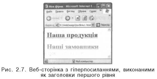 У цьому прикладі слово «Microsoft» міститься у тегу зовнішнього гіперпосилання, а текст «мою особисту сторінку» — у тегу внутрішнього посилання. Текст «кінці цієї сторінки» розміщений у тегу посилання на якір, а «в цьому текстовому документі» — у тегу гіпер- посилання з атрибутом HREF, в якому задано зв'язок не з веб-сто- рінкою, а з текстовим документом, котрий збережений у тій самій папці, що й поточний HTML-документ. Текст «01ena@zirka.lviv.ua» вміщено у тег, що описує мітку якоря, а в атрибуті HREF зазначено адресу електронної пошти. Якщо відвідувач веб-сторінки скористається зовнішнім гіперпосиланням Microsoft, то відкриється сторінка, що міститься за адресою: http://www.microsoft.com/. Після клацання гіперпосилання мою особисту сторінку відкриється веб-сторінка, записана у файлі main.htm, який міститься у тій самій папці, що й поточна сторінка. Після клацання внутрішнього посилання в цьому текстовому документі відкриється вікно з текстовим документом text.doc, що міститься у поточній папці. Якщо скористатися посиланням на якір кінці цієї сторінки, то зображення поточної веб-сторінки зміститься так, що текст мітки «01ena@zirka.lviv.ua», з якою зв'язаний якір, буде розміщений у видимій на екрані частині документа. Водночас текст «Qlena@zirka.lviv.ua» є гіперпосиланням, скориставшись яким, користувач зможе надіслати листа за допомогою настроєної на своєму комп'ютері електронної пошти за вказаною в атрибуті HREF адресою — olena@zirka.lvlv.ua. Розглянемо ще один приклад створення текстових гіперпосилань. Припустимо, що у певній папці збережено два HTML-документи, які описують два напрями роботи фірми, — 1.html та 2.html. Створимо веб-сторінку з переліком гіперпосилань, кожне з яких ілюструватиме один із напрямів роботи фірми: <HTML> <TITLE>Моя фірма</TITLE> <BODY> <Н1><А HREF="1.html">Наша продукція</А></Н1> <Н1><АHREF="2.html">Наші замовники</А></Н1> </BODY> </HTML> У цьому прикладі таги гіперпосилань містяться в тегах заголовків першого рівня. Тексти гіперпосилань будуть розташовані в окремих рядках і оформлені як заголовки першого рівня. За умовчанням текстові гіперпосилання виділені синім кольором і підкреслені, а якщо ними вже скористалися, то темно-червоним. Для зміни цих кольорів додамо відповідні атрибути до тегу <BODY>: <BODY LINK=magenta ALINK=yellow>. Це означає, що після першого завантаження веб-сторінки всі гіперпосилання будуть фіолетового кольору, а якщо відвідувач скористається одним із них, то колір його тексту стане жовтим (рис. 2.7). Це зручно, коли на веб-сторінці є багато посилань, і відвідувач бажає по черзі переглянути їх: тоді надання іншого кольору відвіданим гіперпо- силанням дає змогу систематизувати такий перегляд.